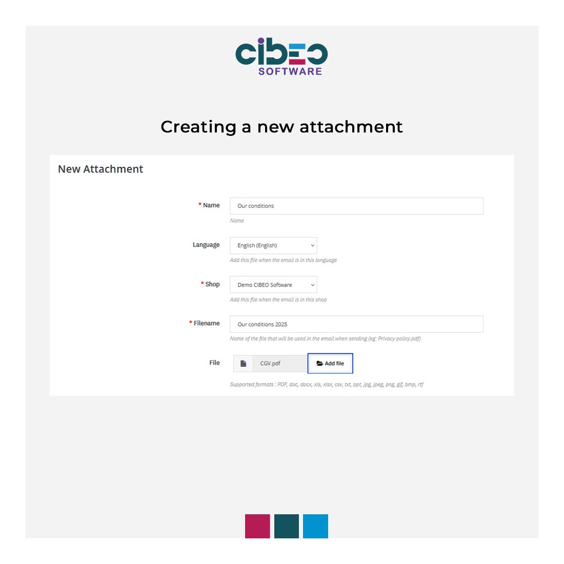 • Intuitive attachment management : easily add, delete or replace documents via the back office